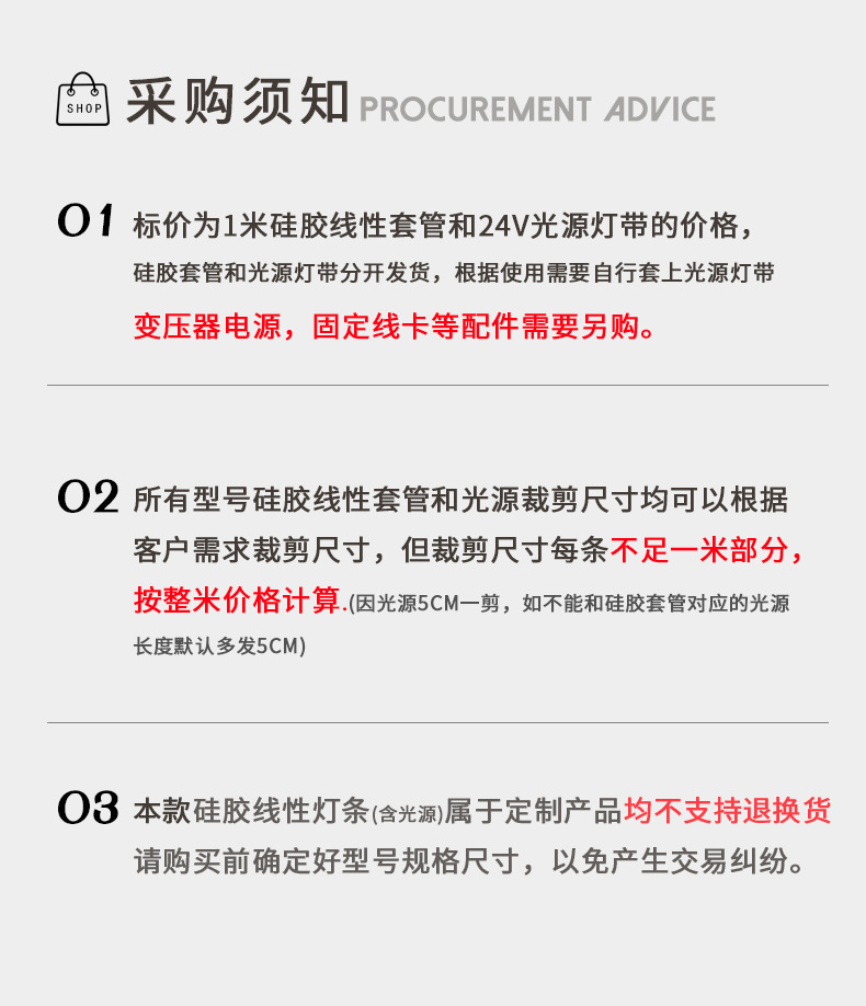 產品規格:白光6000K/中光4000K/暖光3000K/其它光色定制請聯繫客服/鋁合金固定線卡/接線保護套尾冒/24V變壓器60W/24V變壓器100W/24V變壓器200W/24V變壓器300W/ 24V變壓器400W/24V變壓器400W